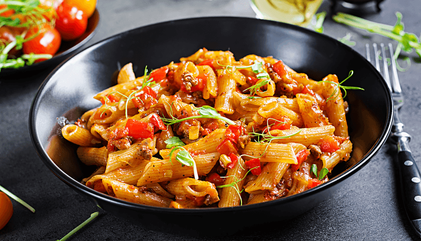 Penne pasta in meaty tomato sauce, adorned with tomatoes and pea sprouts